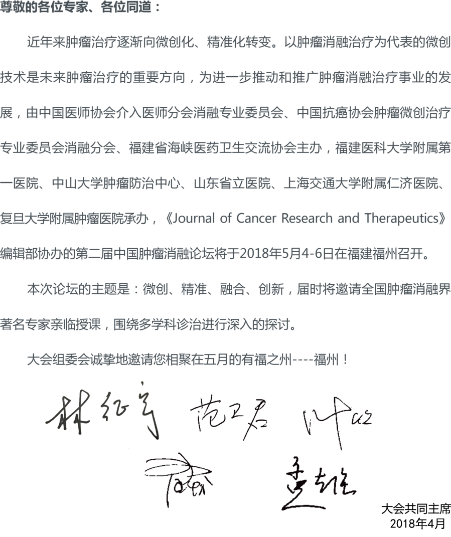 您好,由中國(guó)醫(yī)師協(xié)會(huì)介入醫(yī)師分會(huì)消融專業(yè)委員會(huì)、中國(guó)抗癌協(xié)會(huì)腫瘤微創(chuàng)治療專業(yè)委員會(huì)消融分會(huì)、福建省海峽醫(yī)藥衛(wèi)生交流協(xié)會(huì)主辦的“2018第二屆中國(guó)腫瘤消融論壇暨CT、MRI導(dǎo)向下介入培訓(xùn)班”,于2018年5月4-6日在福州舉行。